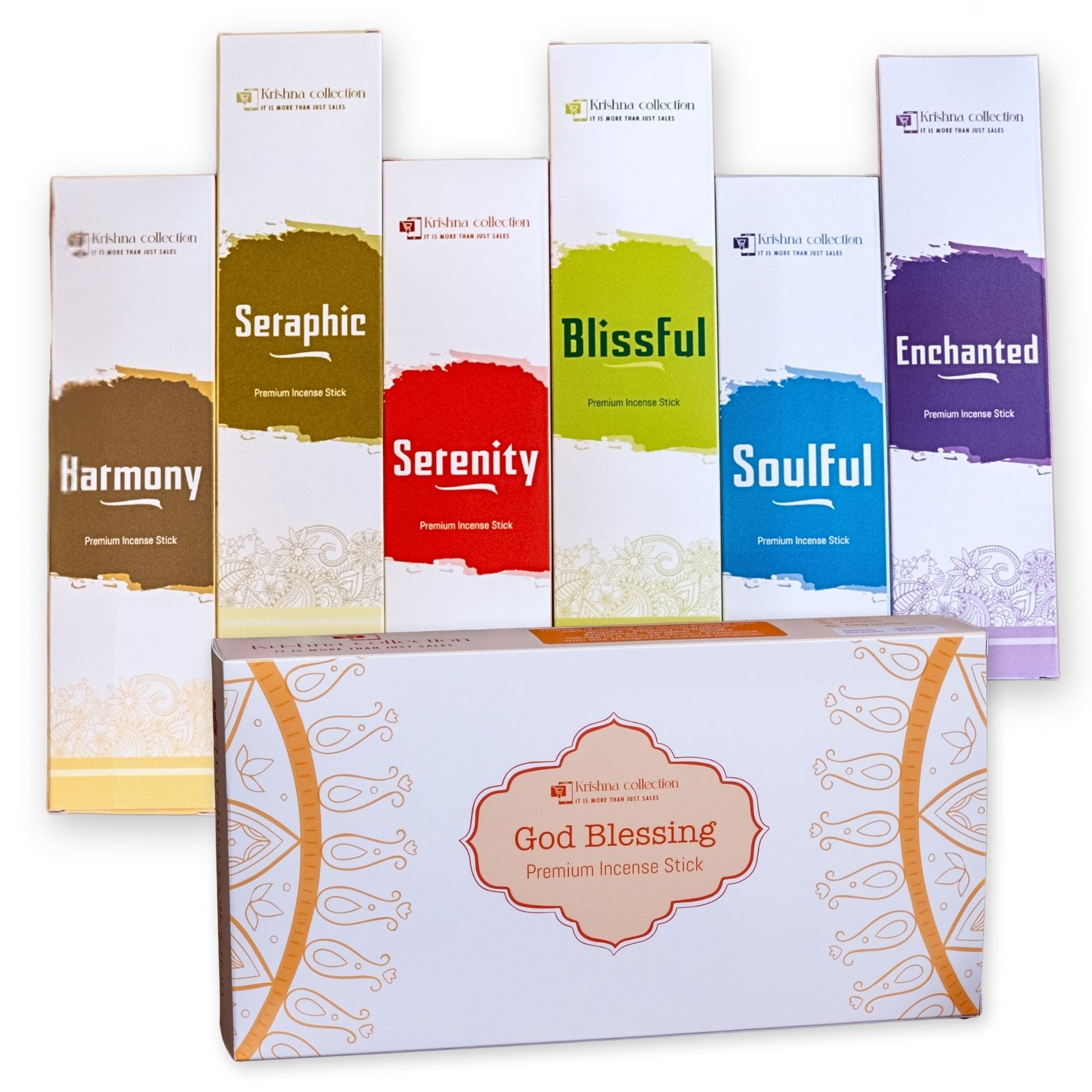 This box of incense sticks comprises 6 sets, each featuring one unique fragrance: Blissful, Harmony, Soulful, Seraphic, Serenity, Enchanted. Indulge in a diverse sensory experience with this thoughtfully curated collection